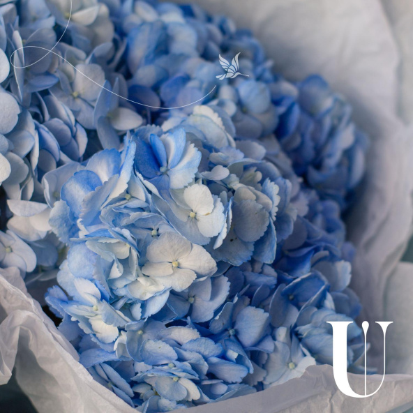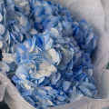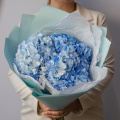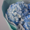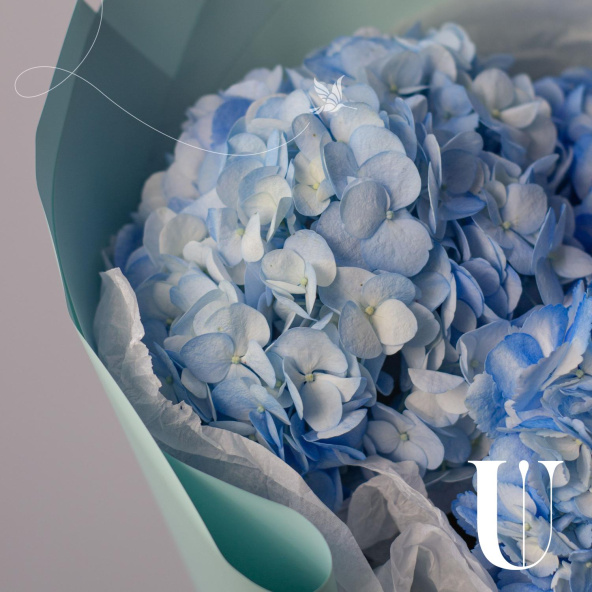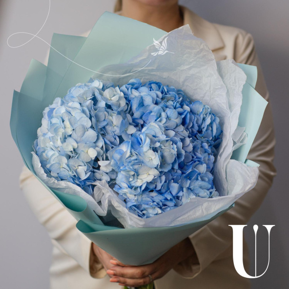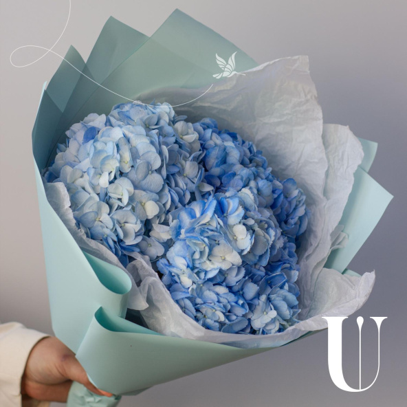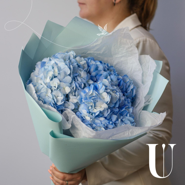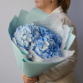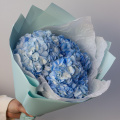 Букет из синей гортензии и ромашки в крафтовой упаковке