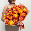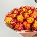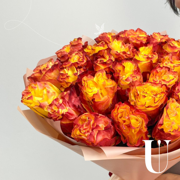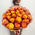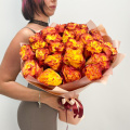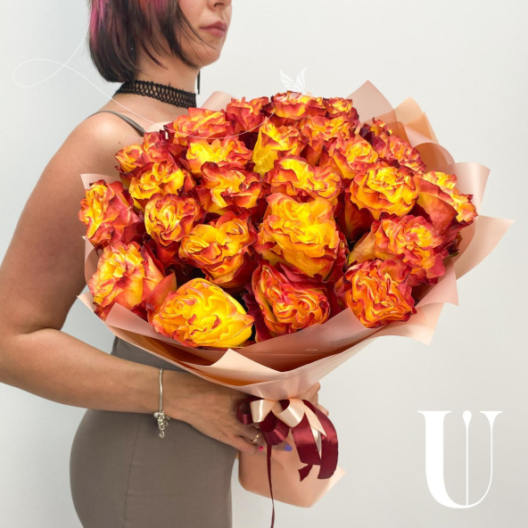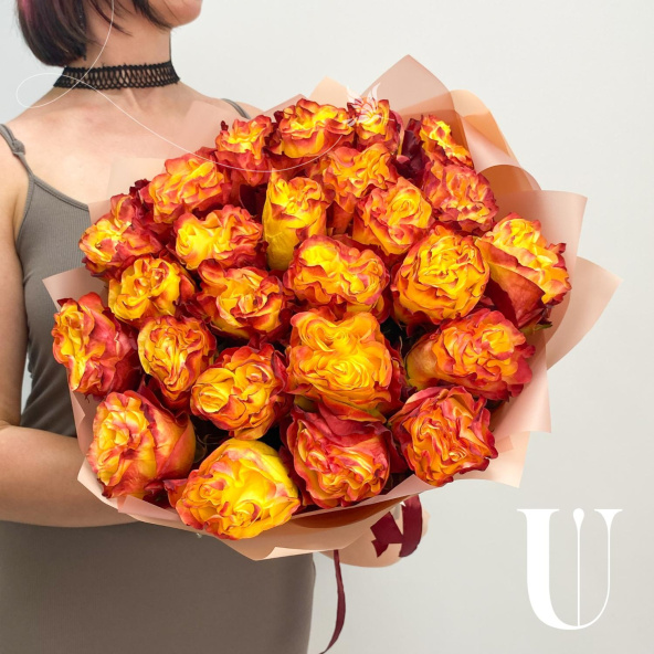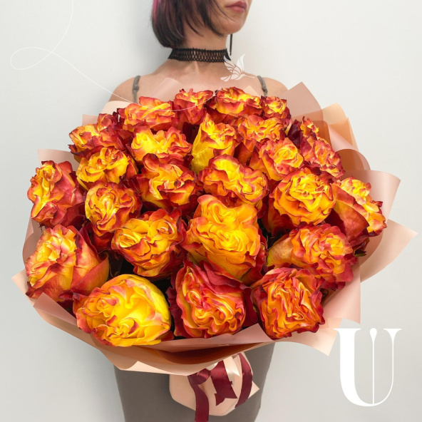 Большой букет из 25 роз сорта Эксплорер в стильной упаковке - горячая роскошь в руках