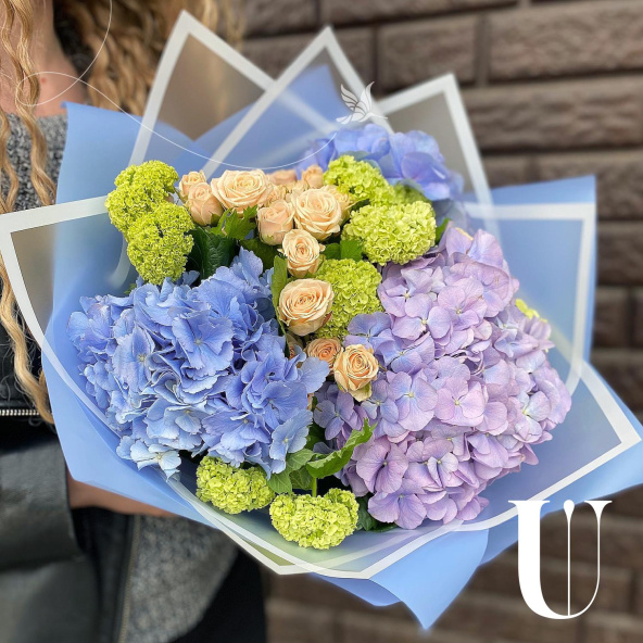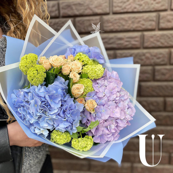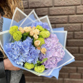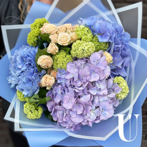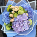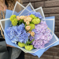 Монобукет из розовых гортензий в дизайнерской упаковке