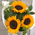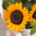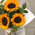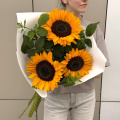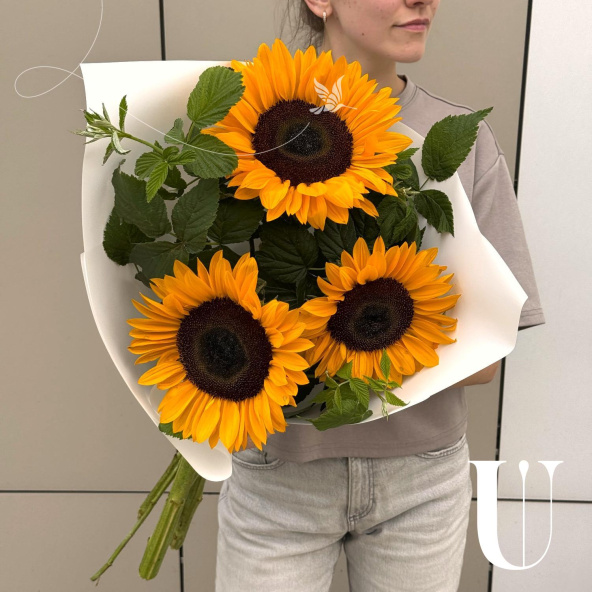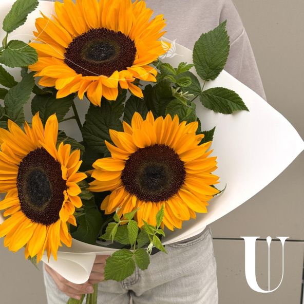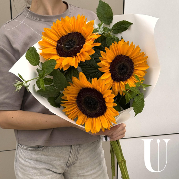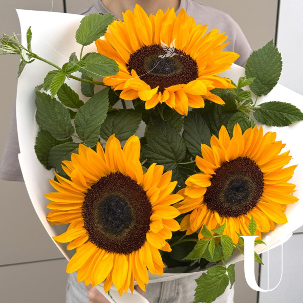 Необычное сочетание классических подсолнухов и листьев малины создаёт неповторимый букет, который переносит вас в самое сердце лета. Это не просто цветы — это настоящая ода летним вкусам и ароматам.