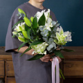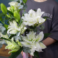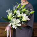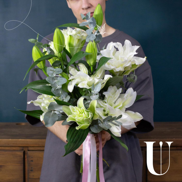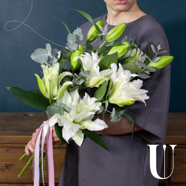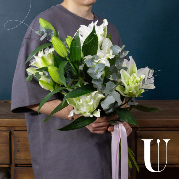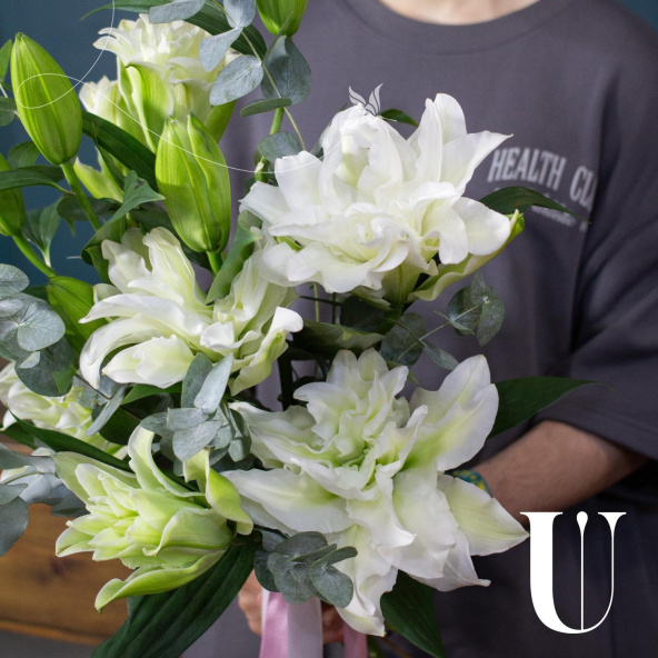 Нежнейший ароматный букет из 5 белых лилий в лаконичной белой упаковке