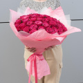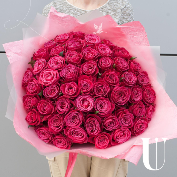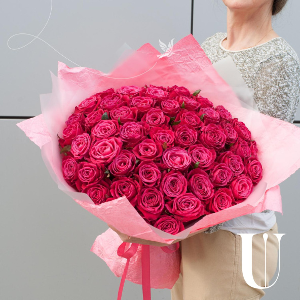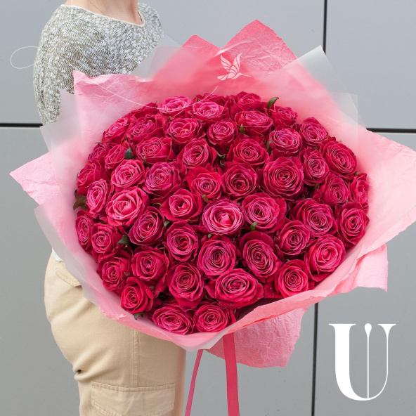 Монобукет состоит из 51 ярко-малиновой розы, что делает его ярким и запоминающимся. Розы собраны на стеблях, что придает букету естественный и натуральный вид.