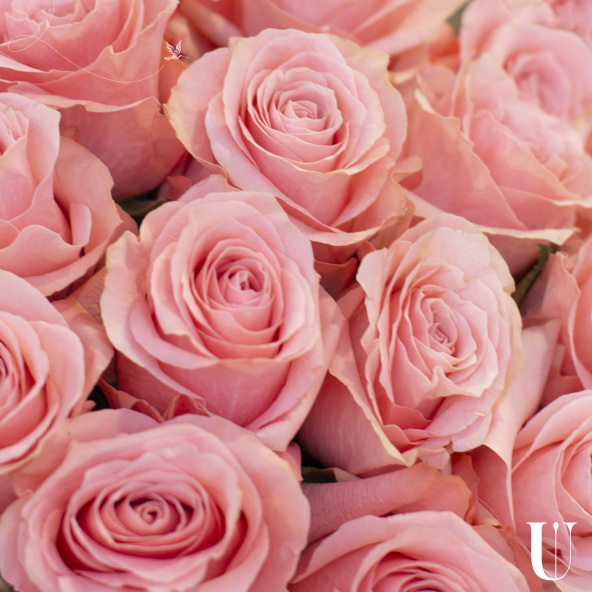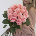 Букет из нежно-розовых кустовых пионовидных роз сорта Мисс Бомбастик 50 см в розовой упаковке