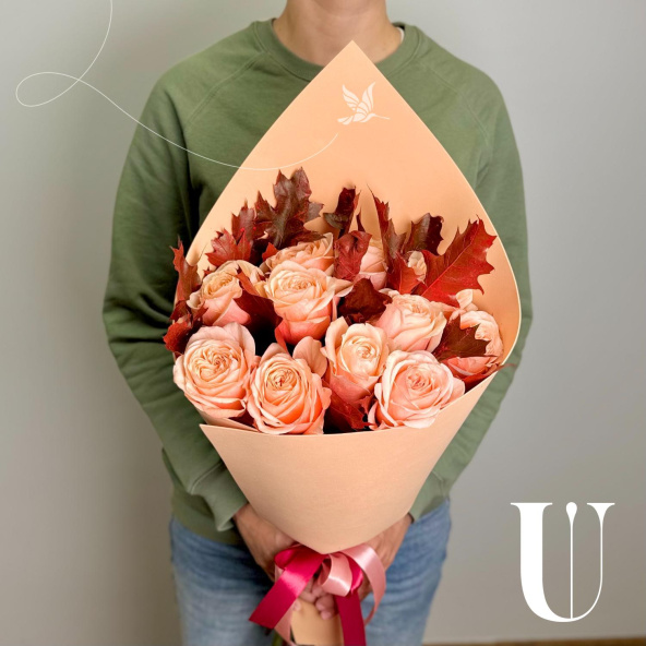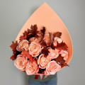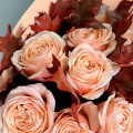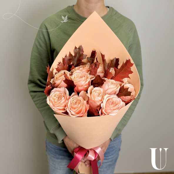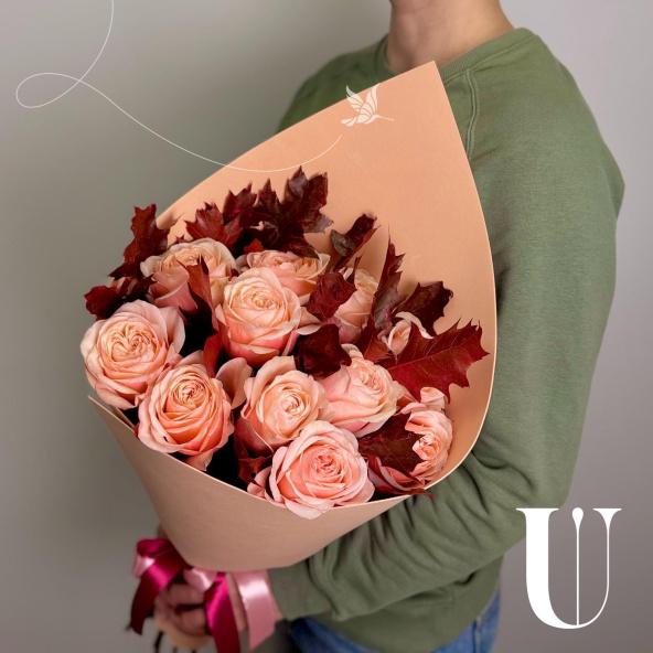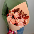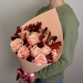 Монобукет из 19 роз сорта Аваланж и эвкалипта в упаковке