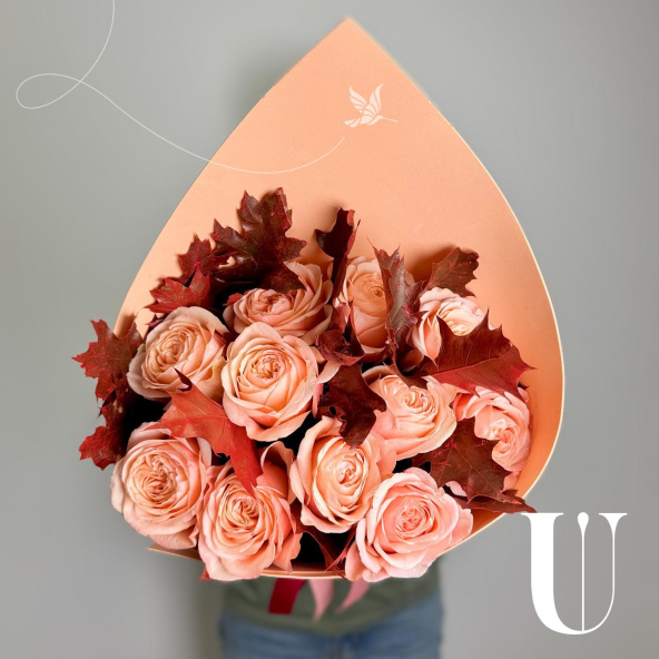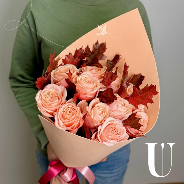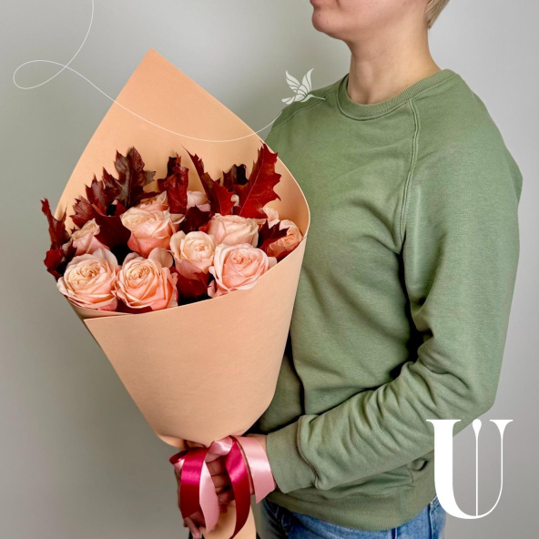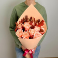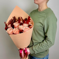 Букет из роз сорта Мондиаль и эрингиумов в упаковке