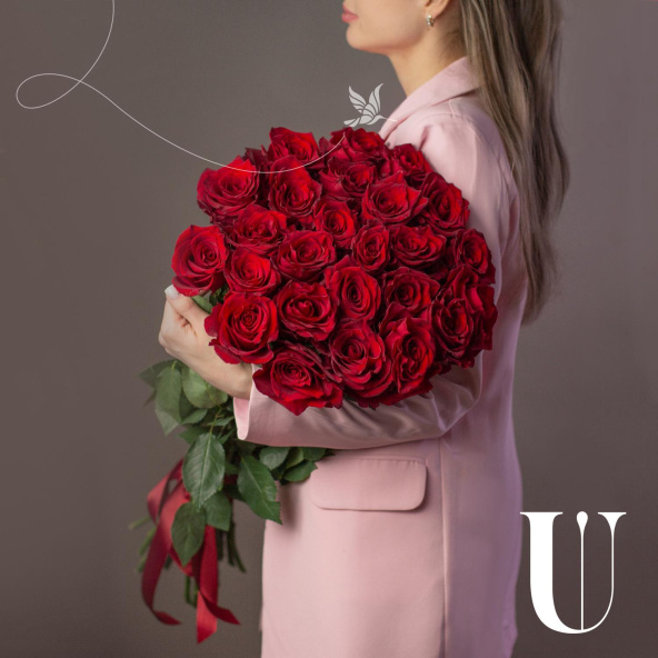 Монобукет из 25 роз сорта Ангажемент с атласной лентой