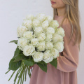 Букет из 25 роз сорта Вайт Охара в глянцевой пленке