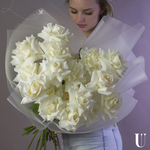 Букет из 25 роз сорта Вайт Охара в глянцевой пленке