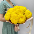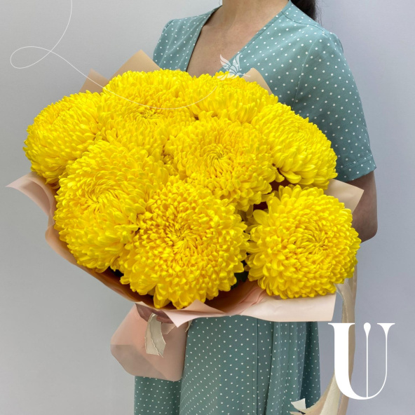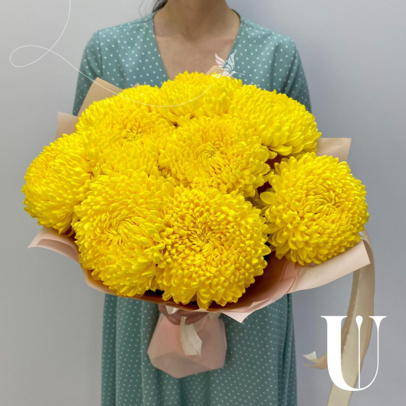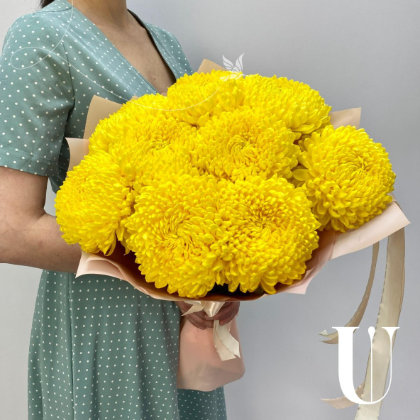 Букет из хризантем Магнум и белых эустом в дизайнерской упаковке