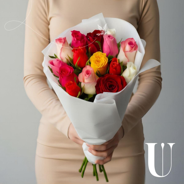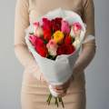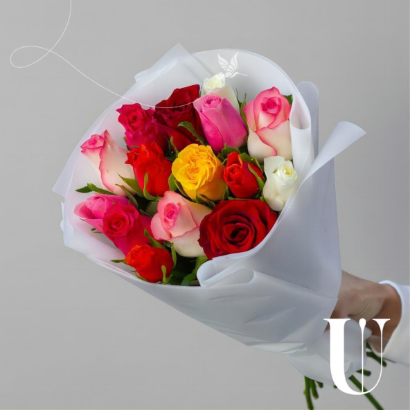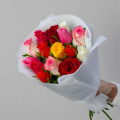Монокомпозиция из кустовых роз в дизайнерской упаковке