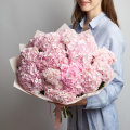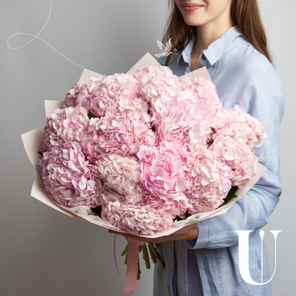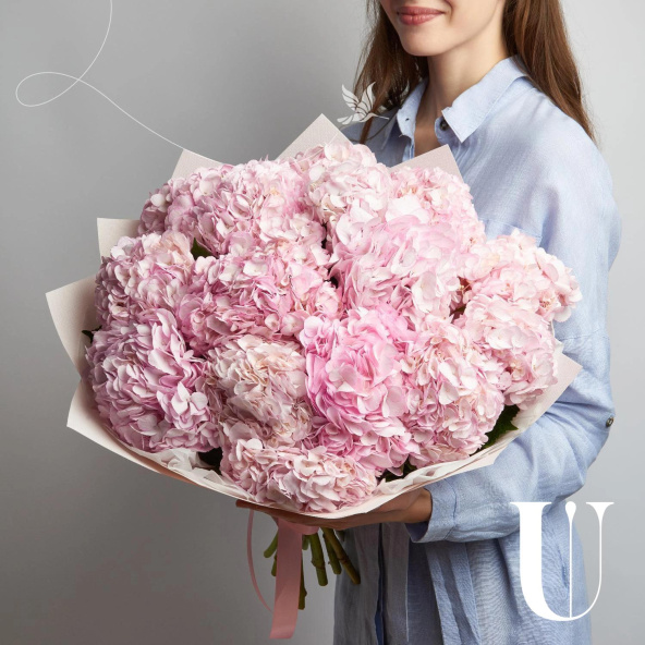 Большой букет из розовых и белых гортензий в дизайнерской упаковке