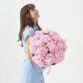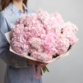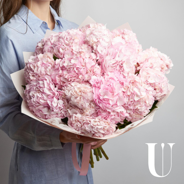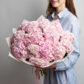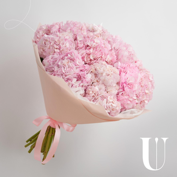 Большой монобукет из белых гортензий в светло-розовой упаковке