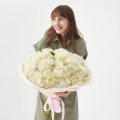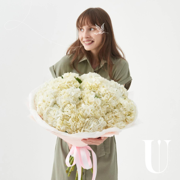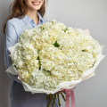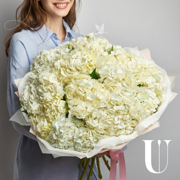 Большой букет из розовых и белых гортензий в дизайнерской упаковке