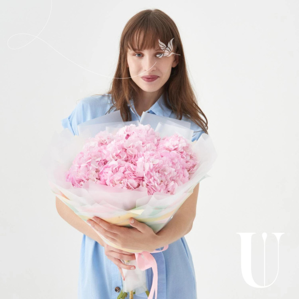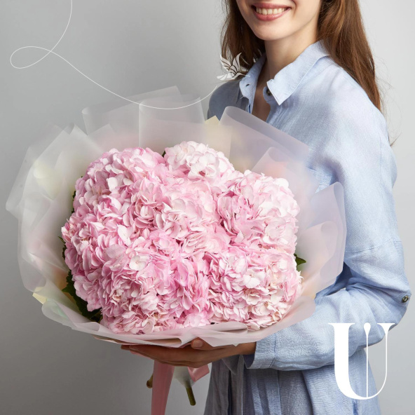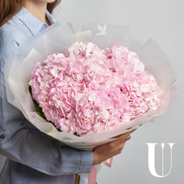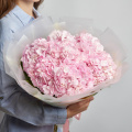 Монобукет из розовых гортензий в дизайнерской упаковке