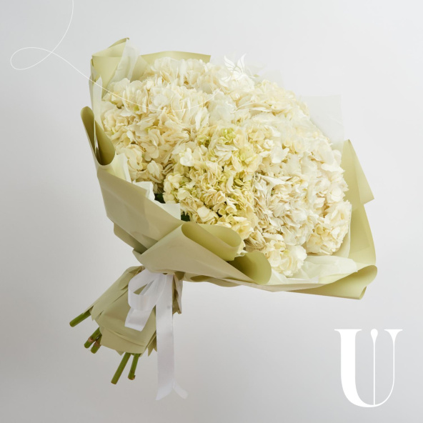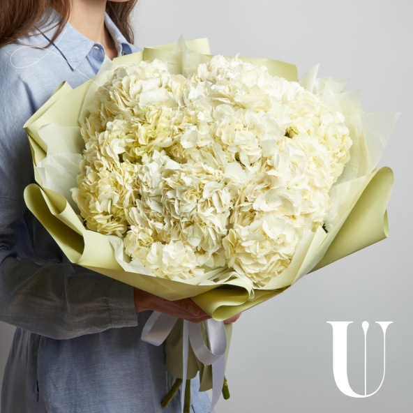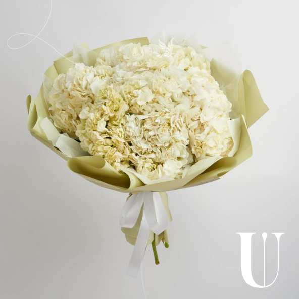 Монобукет из розовых гортензий в дизайнерской упаковке