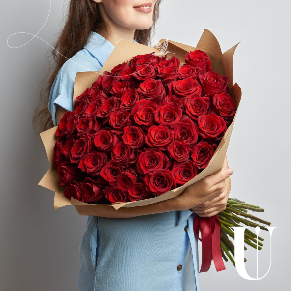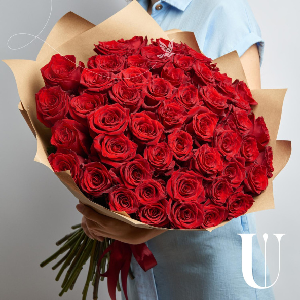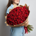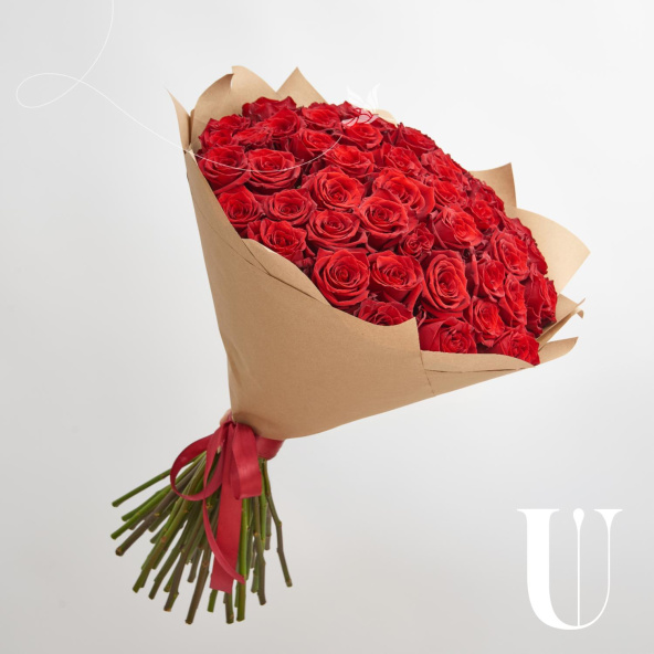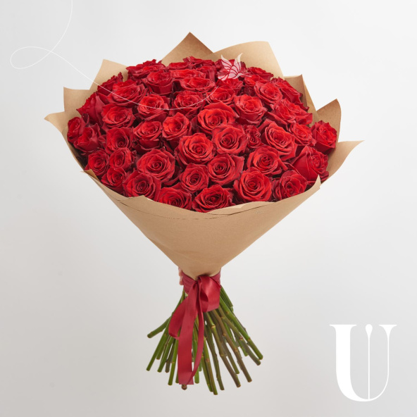 Большой букет из 51 розы сорта Мондиаль в крафтовой упаковке
