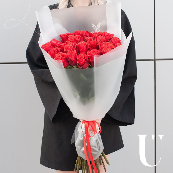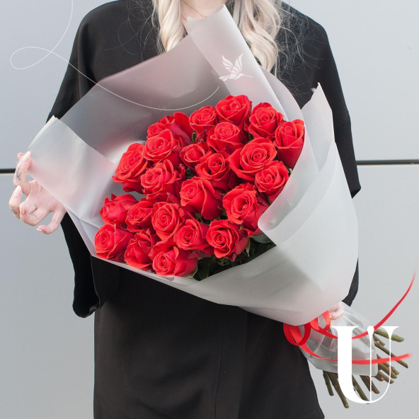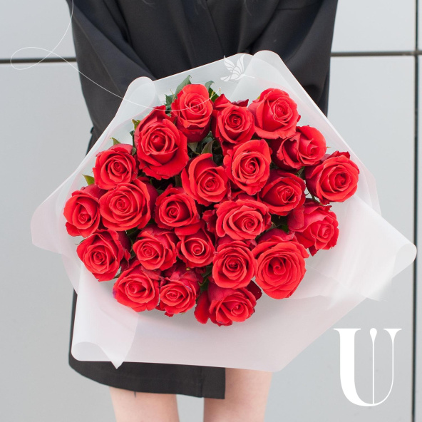 Букет состоит из 25 эквадорских алых роз премиум класса, что гарантирует их высокое качество и великолепный вид.