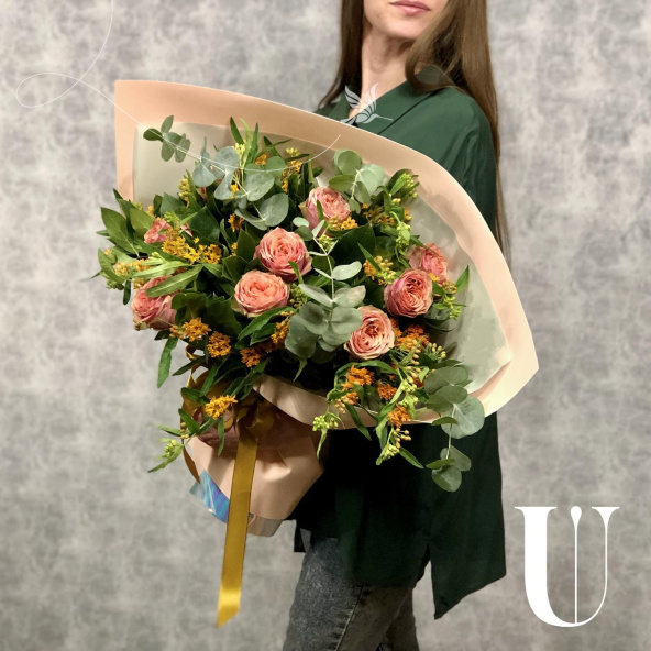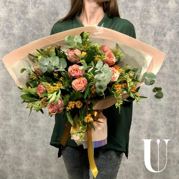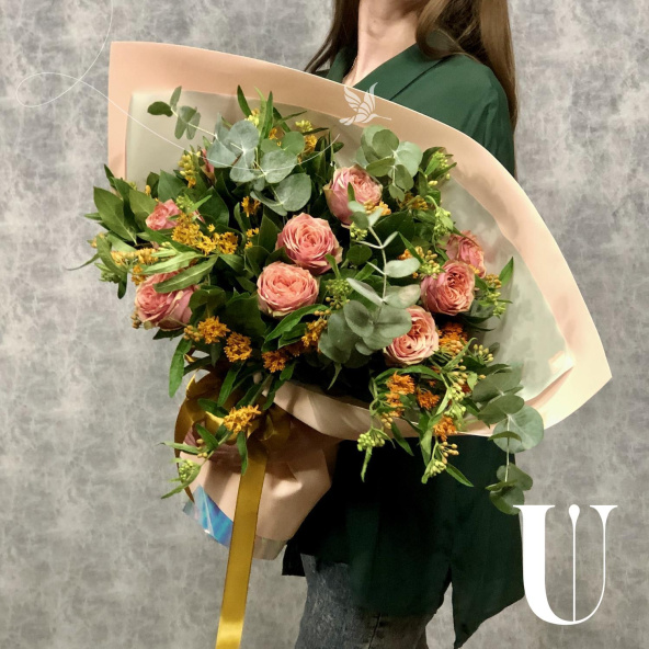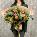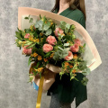 Монобукет из розовых кустовых роз в крафтовой упаковке