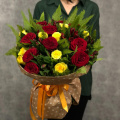 Букет из фиолетовых и розовых роз в в крафтовой упаковке