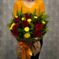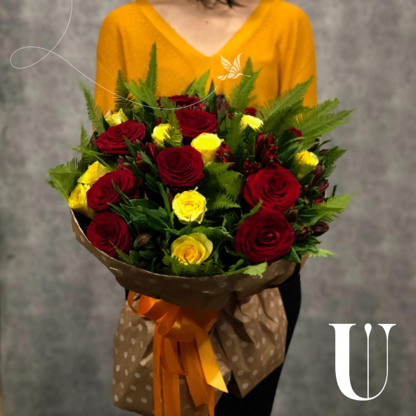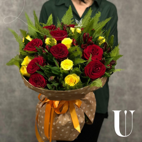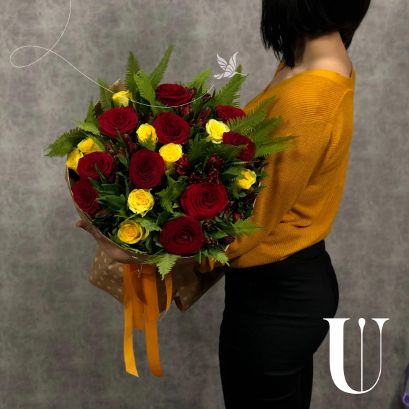 Монобукет из 11 роз сорта Кахала и листьев дуба в упаковке