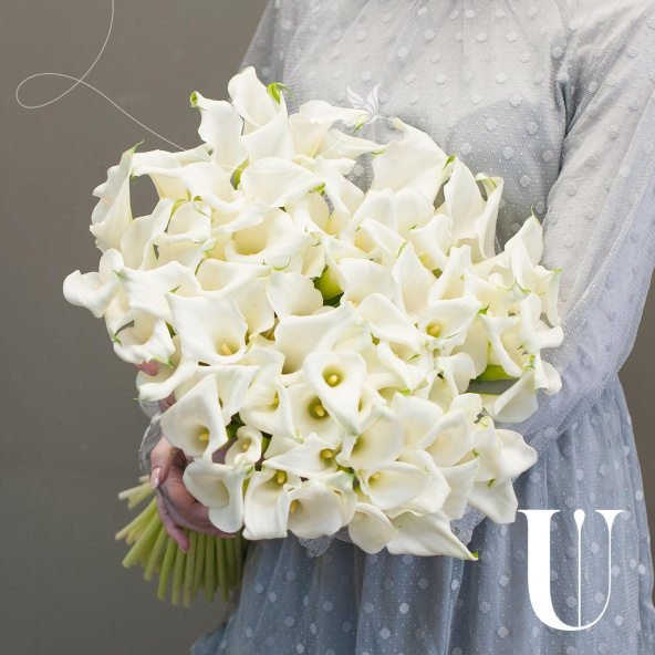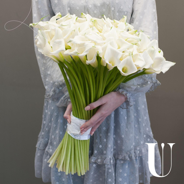 Букет состоит из 101 белой каллы, что делает его ярким и запоминающимся.
