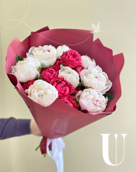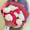 Букет из 7 розовых пионов в дизайнерской пленке