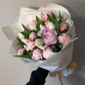 Букет из кустовых роз Лидия и роз Аваланж в дизайнерской упаковке
