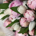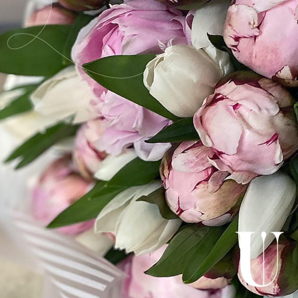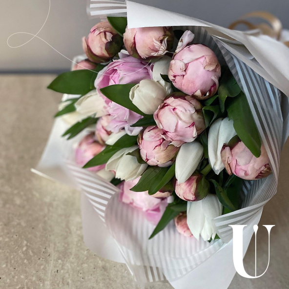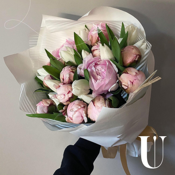 Монобукет из кустовых пионовидных роз Джульетта в дизайнерской упаковке