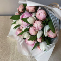 Букет из нежно-розовых кустовых пионовидных роз сорта Мисс Бомбастик 50 см в розовой упаковке