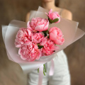 Монобукет из нежно-розовых кустовых пионовидных роз в упаковке