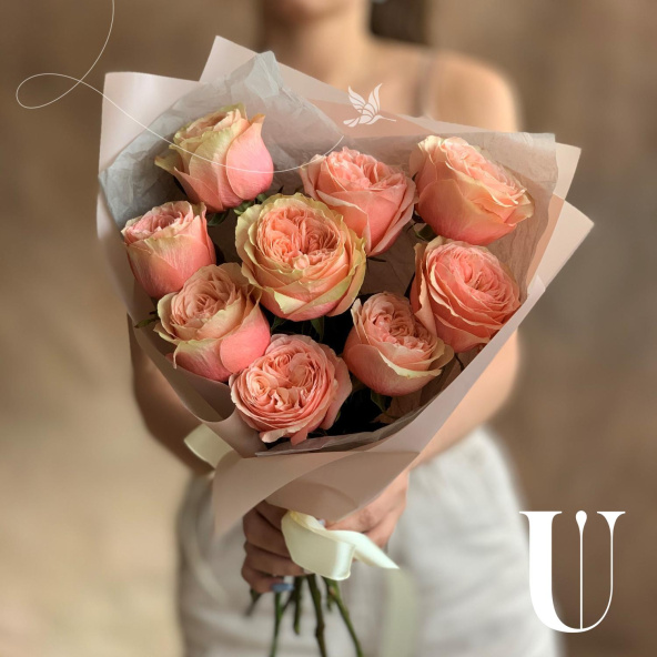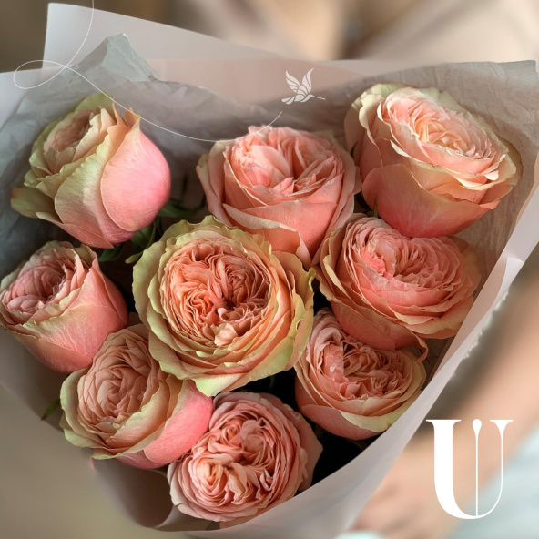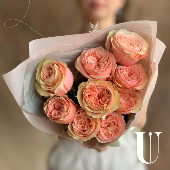 Нежные кустовые пионовидные розы в дизайнерской упаковке
