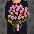Букет из малиновых роз Кантри Блюз и роз Пинк Мондиаль в дизайнерской упаковке