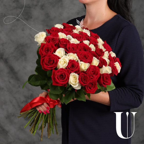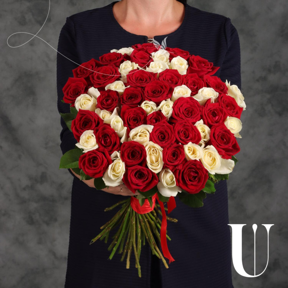 Классический букет из 55 красных и белых роз