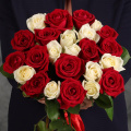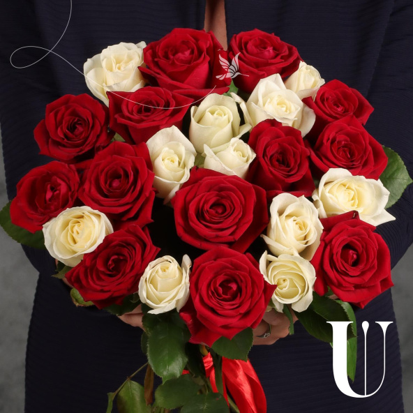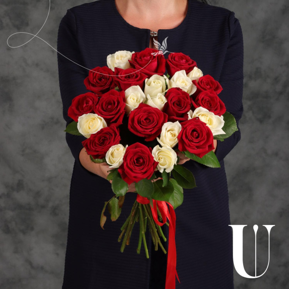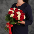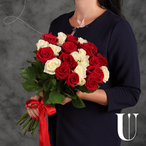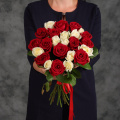 Монобукет из 51 красной и белой розы в розовой упаковке