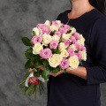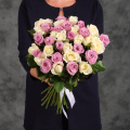 Монобукет из 25 кремовых роз в дизайнерской упаковке
