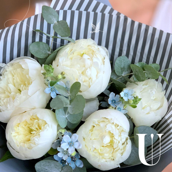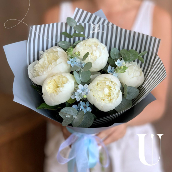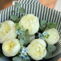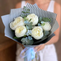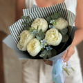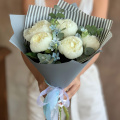 Букет из белых кустовых пионовидных роз сорта Бомбастик в упаковке