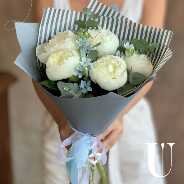 Монобукет из белых кустовых хризантем в голубой упаковке