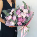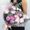 Монобукет из розовых кустовых пионовидных роз в упаковке