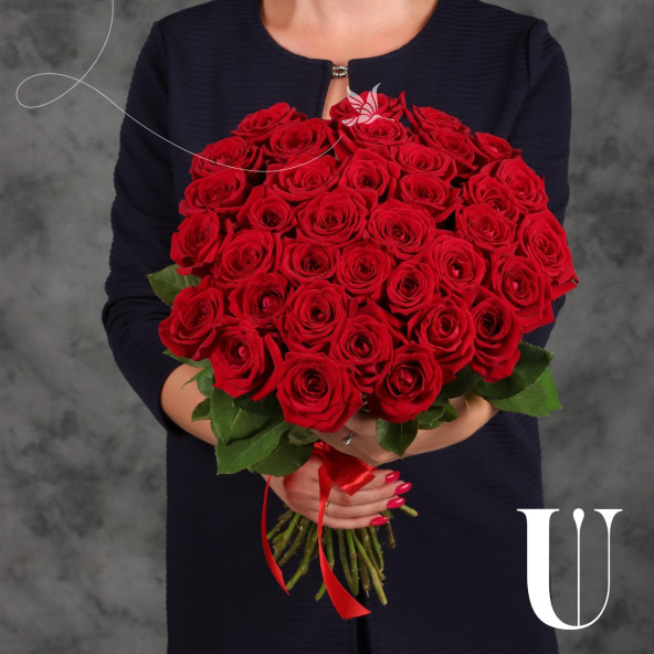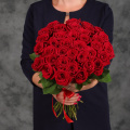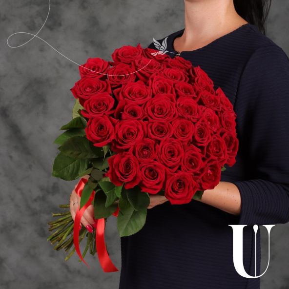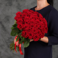 Монобукет из роз сорта Ред Наоми 60 см с атласными лентами