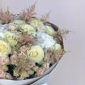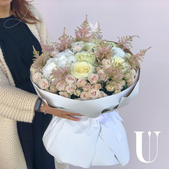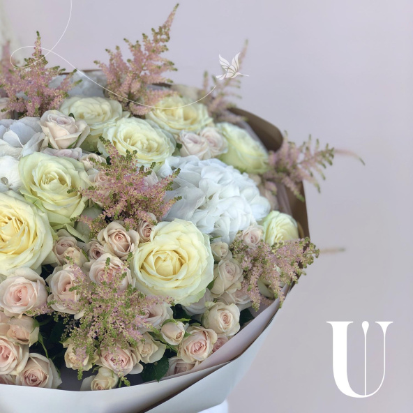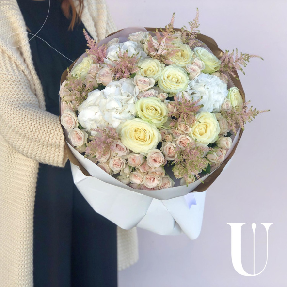 Стильный букет из роз в сочетании с воздушной астильбой и гортензией украсит любое событие