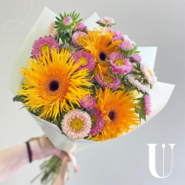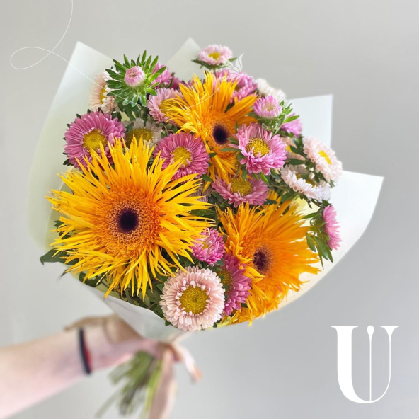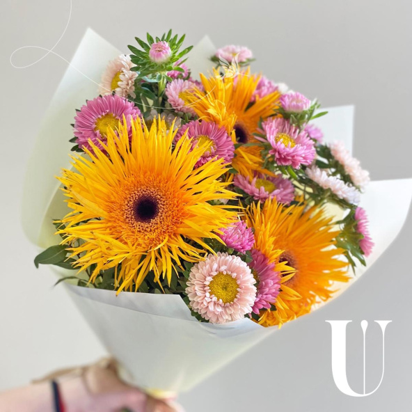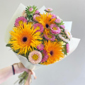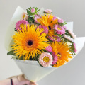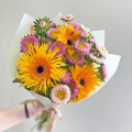 Букет из разноцветных гербер мини в дизайнерской упаковке