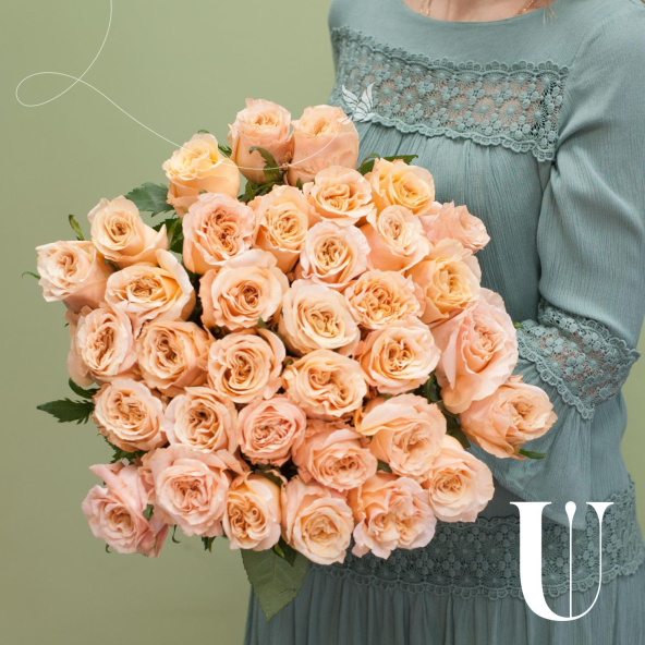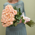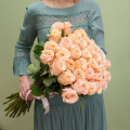 Монобукет из 29 нежных пионовидных роз с атласной лентой