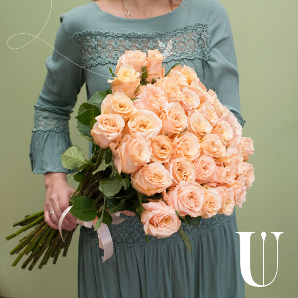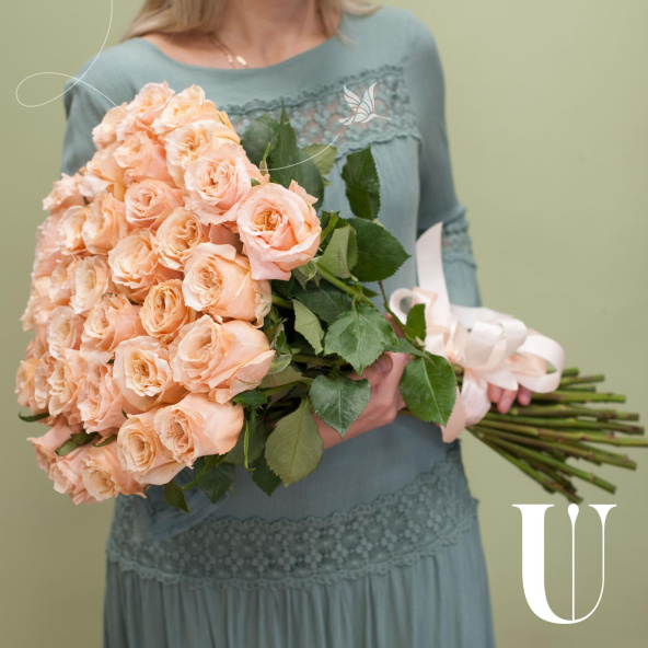 Большой букет из 51 кремовой розы сорта Шармант в дизайнерской упаковке