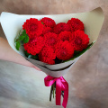 Монобукет из 15 красных роз и белого хлопка в упаковке