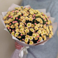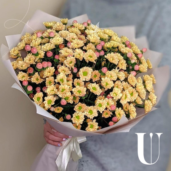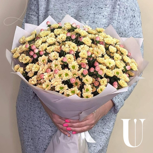 Букет из хризантем Магнум и белых эустом в дизайнерской упаковке