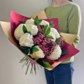 Букет из белых пионовидных роз и нежных кустовых роз в упаковке