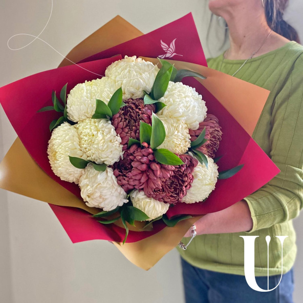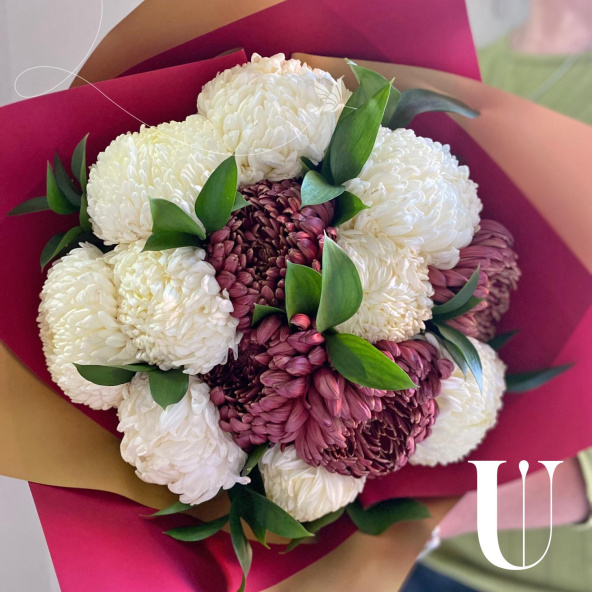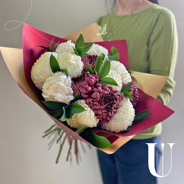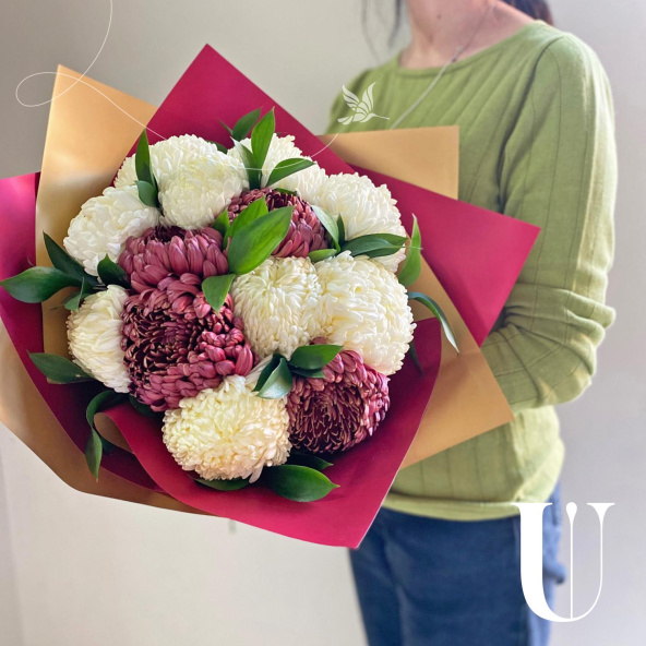 Монобукет из 7 бордовых хризантем сорта Бигуди в дизайнерской упаковке
