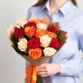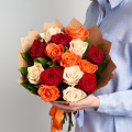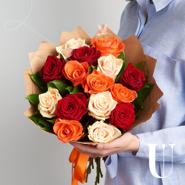 Монобукет из 15 роз микс в белой дизайнерской пленке