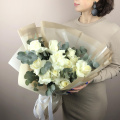 Композиция из белых роз, нобилиса и хлопка в упаковке