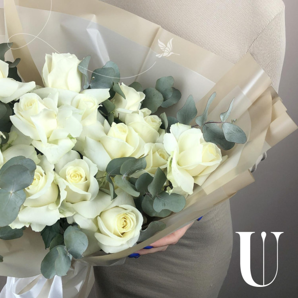Монобукет из 51 белой розы Аваланж 40 см в глянцевой пленке